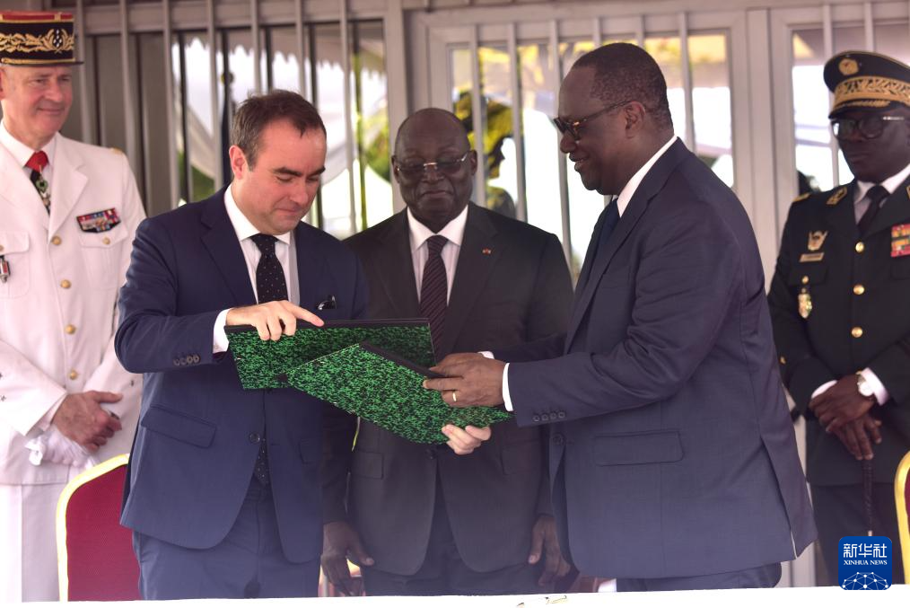 2月20日,在科特迪瓦经济首都阿比让的布埃港,法国国防部长塞巴斯蒂安·勒科尔尼(前左)和科特迪瓦国防部长泰内·比拉希马·瓦塔拉(前右)在军事基地移交仪式现场签署文件。
