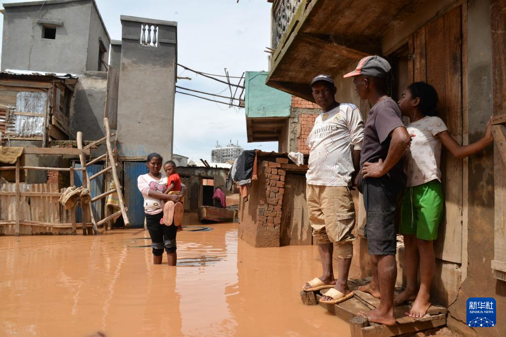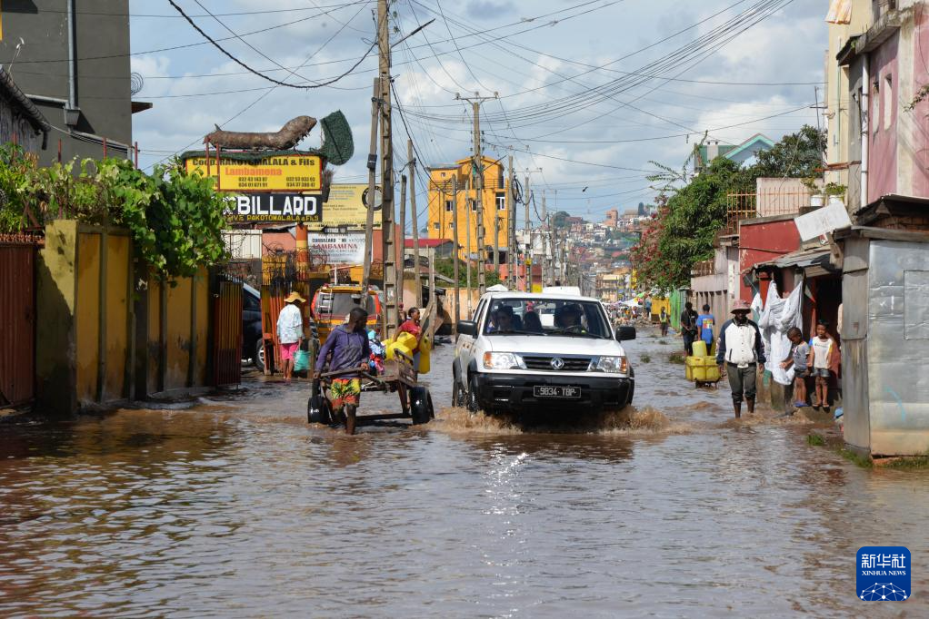 2月20日,在马达加斯加首都塔那那利佛,人们查看被水淹的路面。