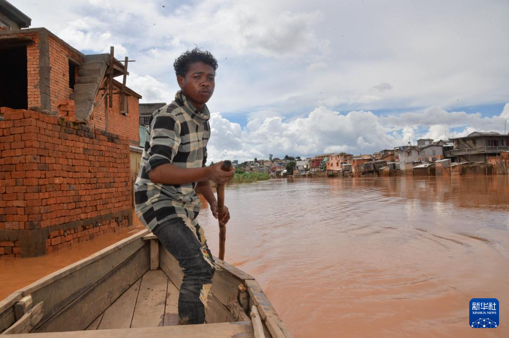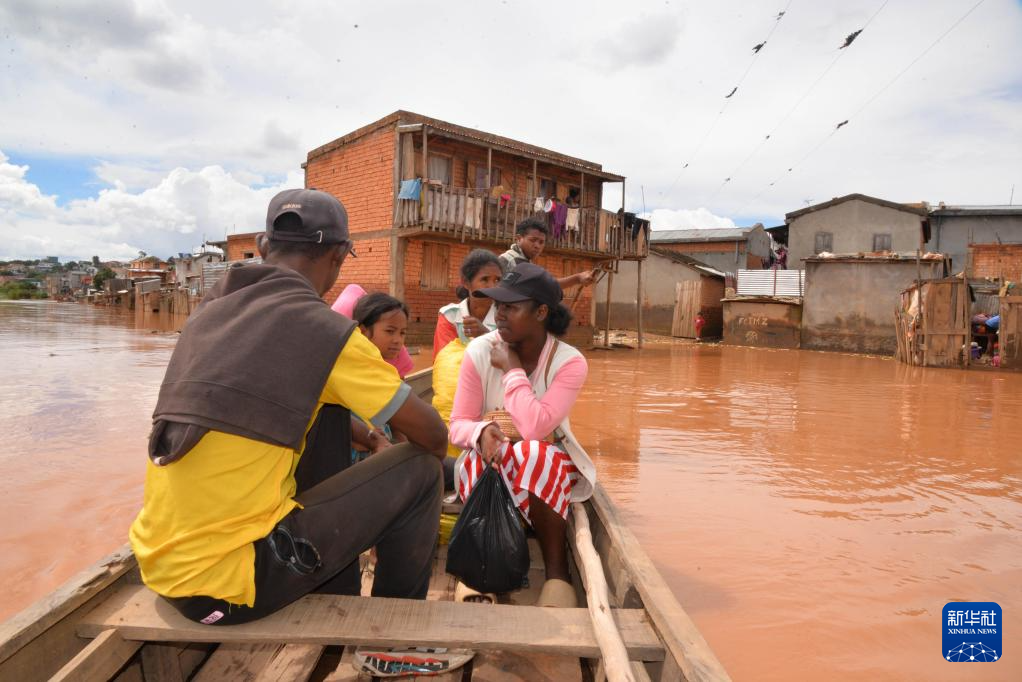 2月20日,在马达加斯加首都塔那那利佛,人们乘船通过被水淹的道路。