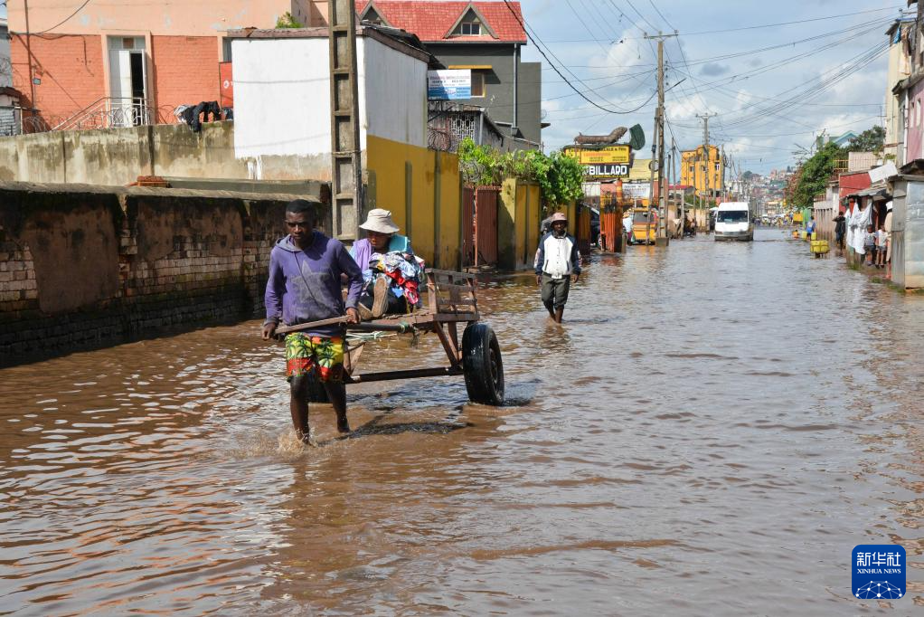 2月20日,在马达加斯加首都塔那那利佛,人们从被水淹的路上走过。