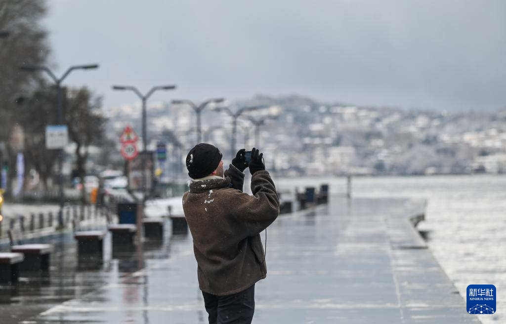 2月21日,一男子在土耳其伊斯坦布尔博斯普鲁斯海峡岸边拍照。