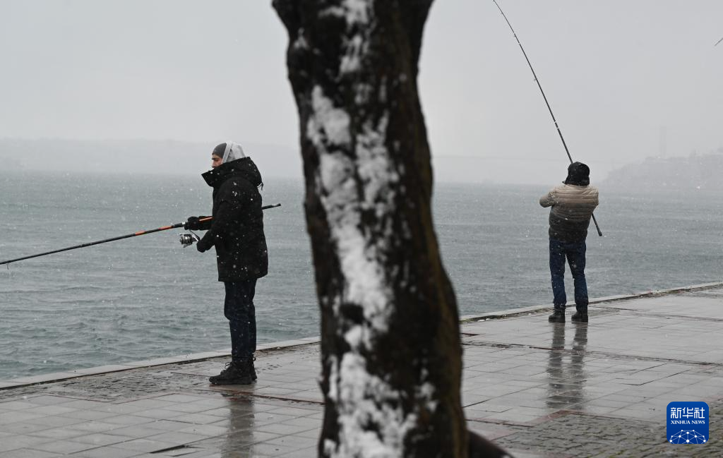 2月21日,人们在土耳其伊斯坦布尔博斯普鲁斯海峡岸边钓鱼。