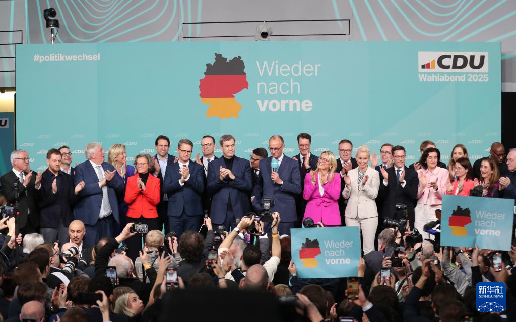 这是2月23日,在德国柏林的基督教民主联盟总部,联盟党总理候选人默茨在出口民调显示领先后接受祝贺。新华社记者 杜哲宇 摄
