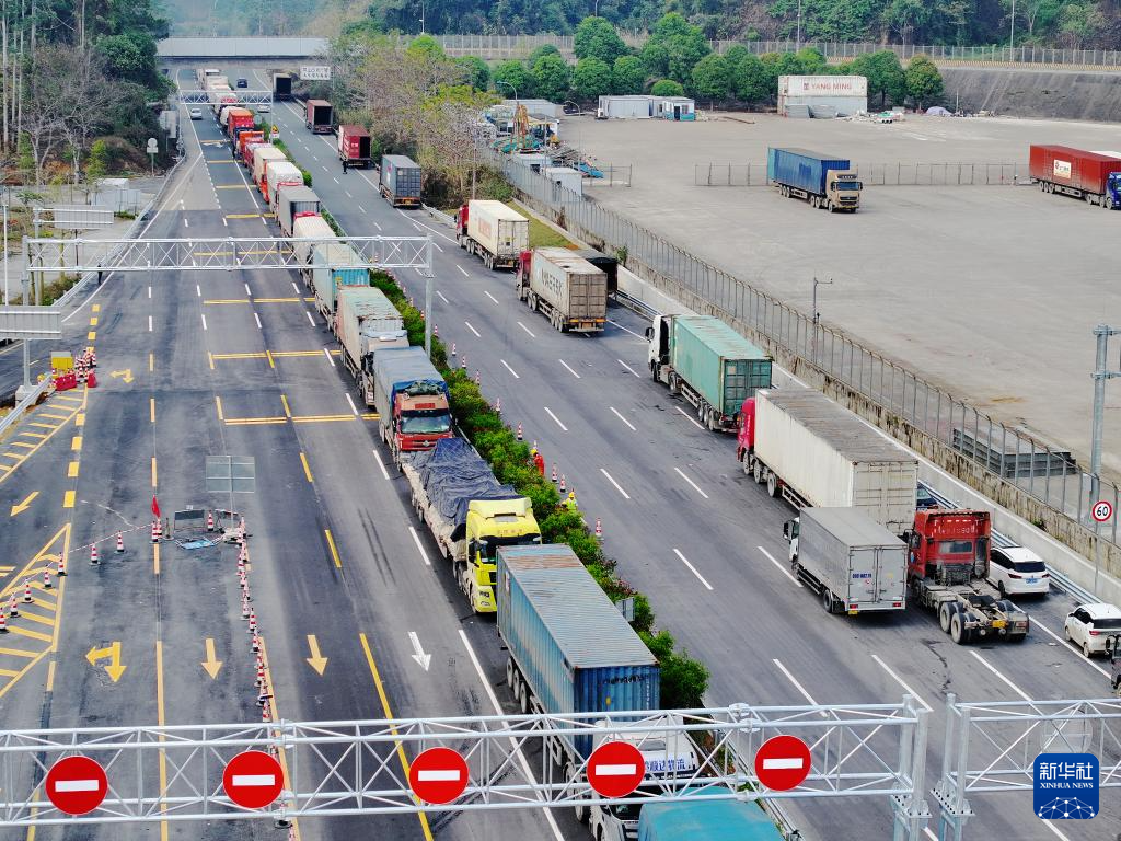 这是3月1日在广西凭祥友谊关口岸拍摄的排队车辆(无人机照片)。