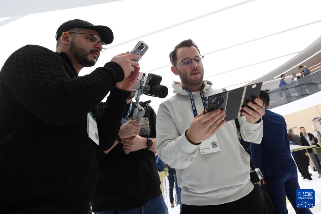 3月3日,在西班牙巴塞罗那举行的2025年世界移动通信大会上,参观者拍摄手机展品。