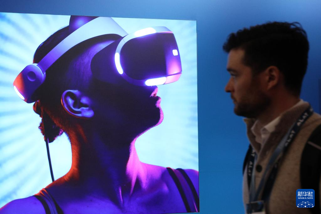 3月3日,在西班牙巴塞罗那举行的2025年世界移动通信大会上,一名参观者走过头显设备展台。