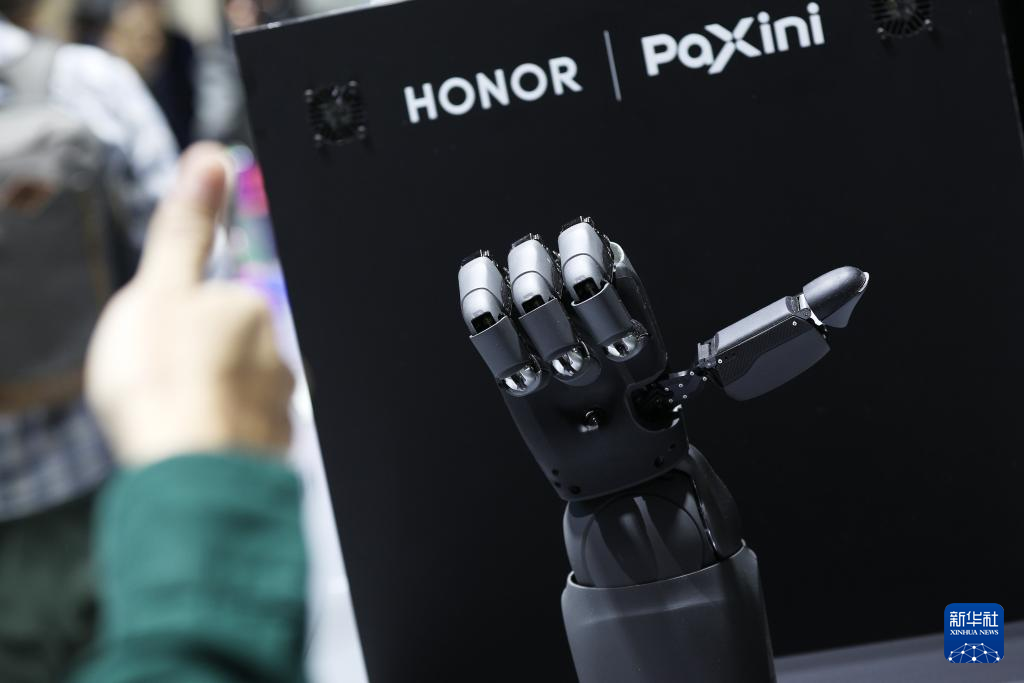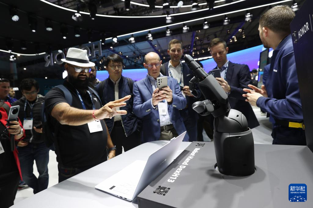 3月3日,在西班牙巴塞罗那举行的2025年世界移动通信大会上,参观者与多维触觉灵巧手互动。