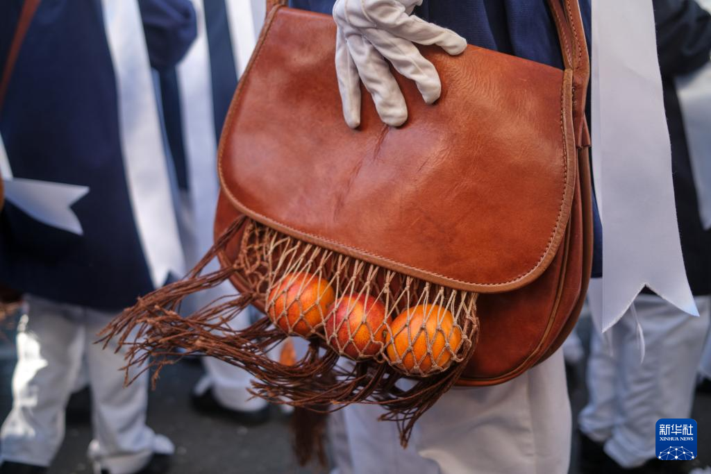 这是3月4日在比利时南部小镇班什拍摄的一名装扮成“农夫”形象的狂欢节参加者随身携带的血橙。