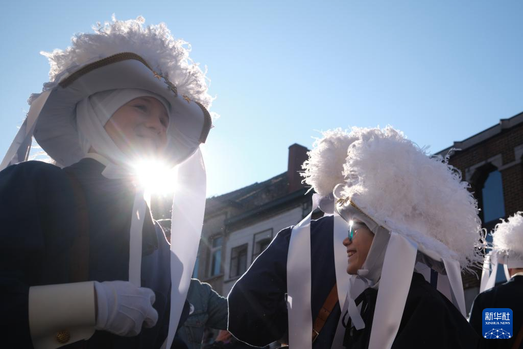 3月4日,在比利时南部小镇班什,孩子们装扮成“农夫”形象参加狂欢节游行。