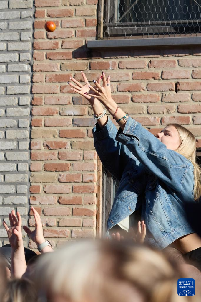 3月4日,在比利时南部小镇班什,一名游客在“血橙盛典”上接抛来的血橙。