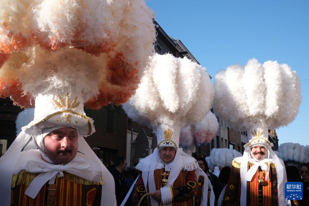 3月4日,在比利时南部小镇班什,人们装扮成“憨人”形象参加狂欢节游行。