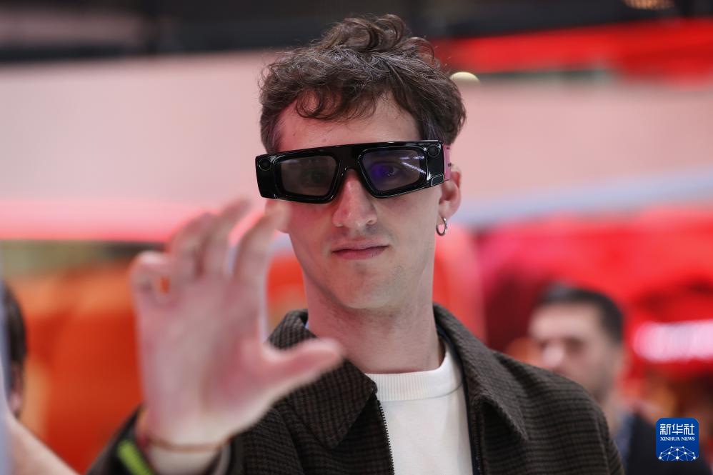 3月6日,在西班牙巴塞罗那举行的2025年世界移动通信大会上,一名男子体验智能眼镜。