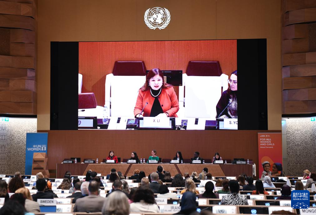 3月7日,在瑞士日内瓦万国宫,中国代表在联合国国际劳动妇女节纪念活动暨北京世界妇女大会三十周年对话会上讲话。