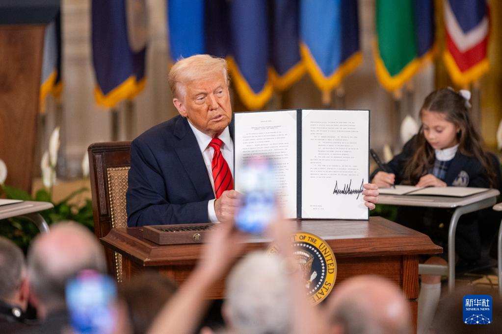 3月20日,美国总统特朗普在华盛顿白宫展示签署的行政令。 新华社记者 胡友松 摄