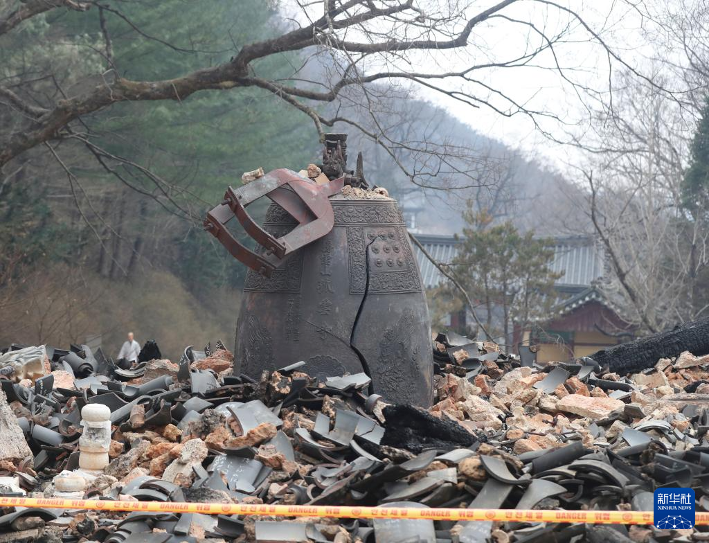 这是3月27日在韩国庆尚北道义城郡拍摄的大火过后的古寺孤云寺废墟。