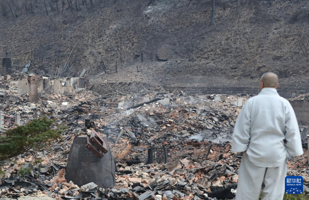 3月27日,在韩国庆尚北道义城郡,僧人站在大火过后的古寺孤云寺废墟前。