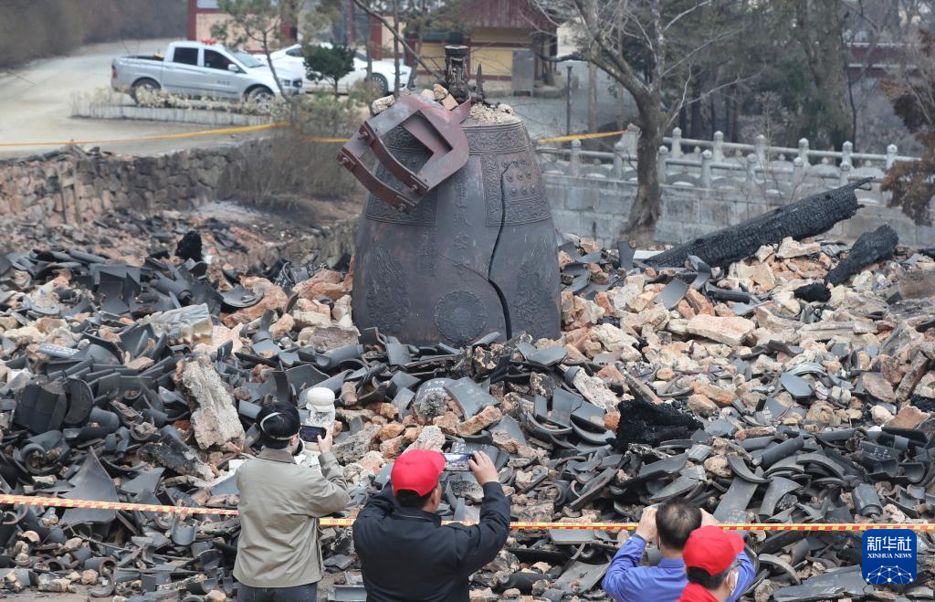 3月27日,在韩国庆尚北道义城郡,民众拍摄大火过后的古寺孤云寺废墟。