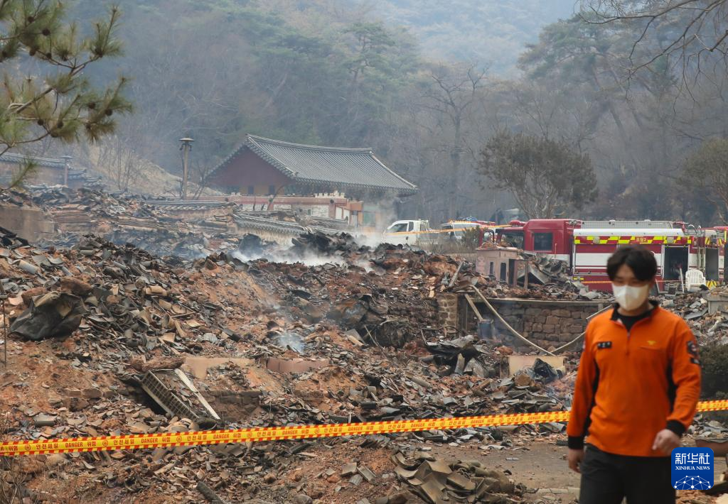 3月27日,在韩国庆尚北道义城郡,消防员经过大火过后的孤云寺废墟。