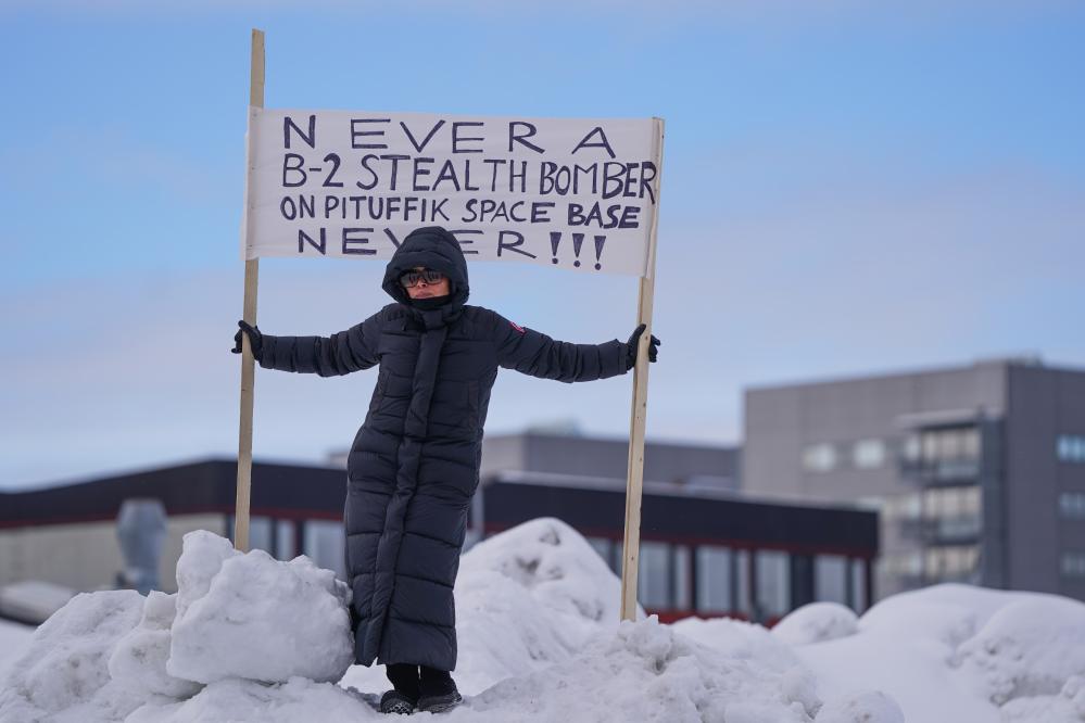 3月28日,在丹麦自治领地格陵兰岛首府努克,一名女子举着抗议标语。新华社记者彭子洋摄