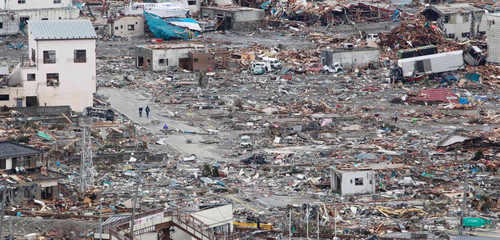 2011年3月16日,在日本大地震重灾区岩手县大船渡市,几名男子在城市的废墟上行走。2011年3月11日,日本东北部海域发生9.0级大地震及海啸。新华社记者 任正来 摄