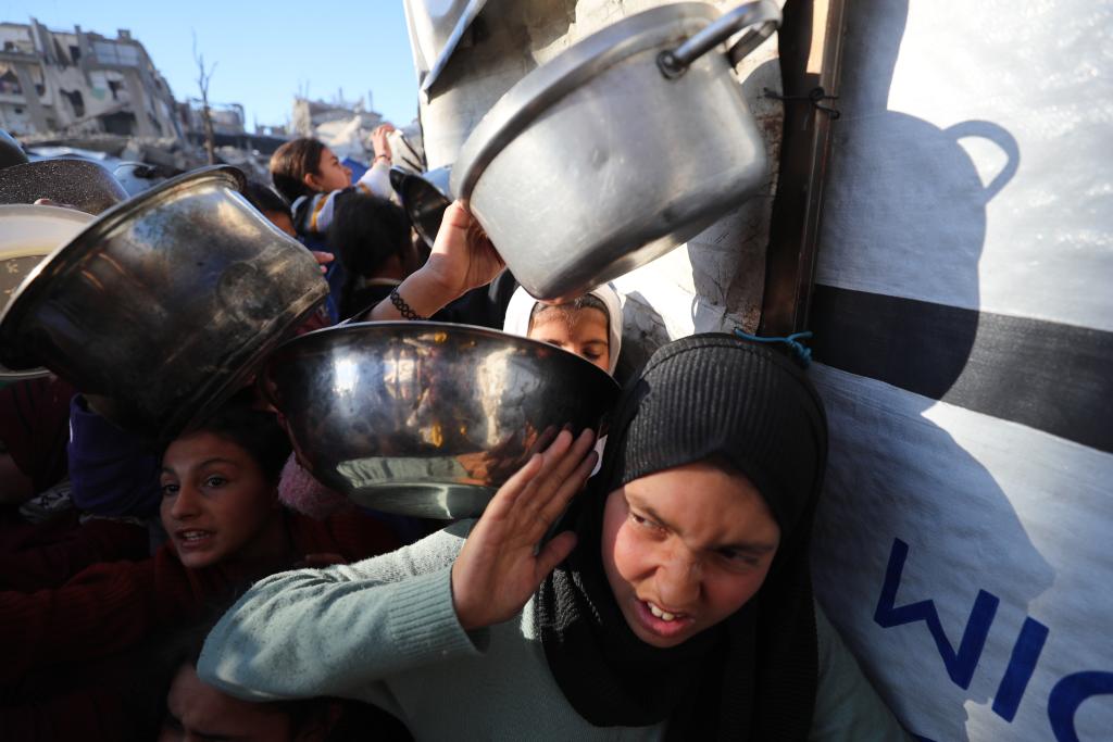 3月22日,在加沙地带北部拜特拉希耶,人们领取救助食物。新华社发(马哈茂德·扎基摄)