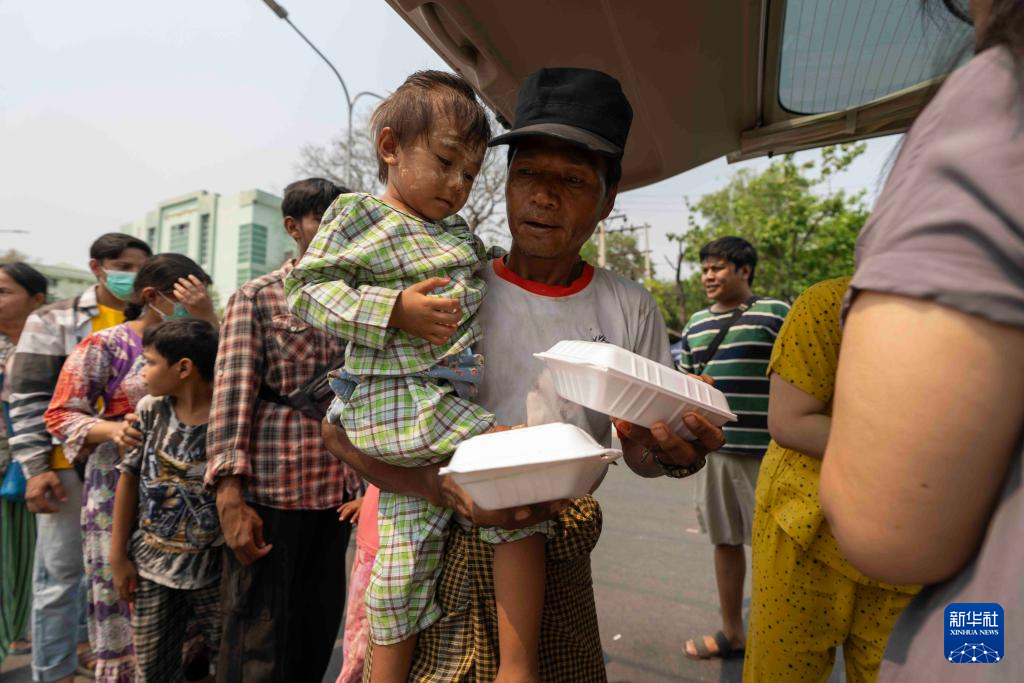 4月3日,在缅甸曼德勒医学院附近的一处安置点,人们领取食物。