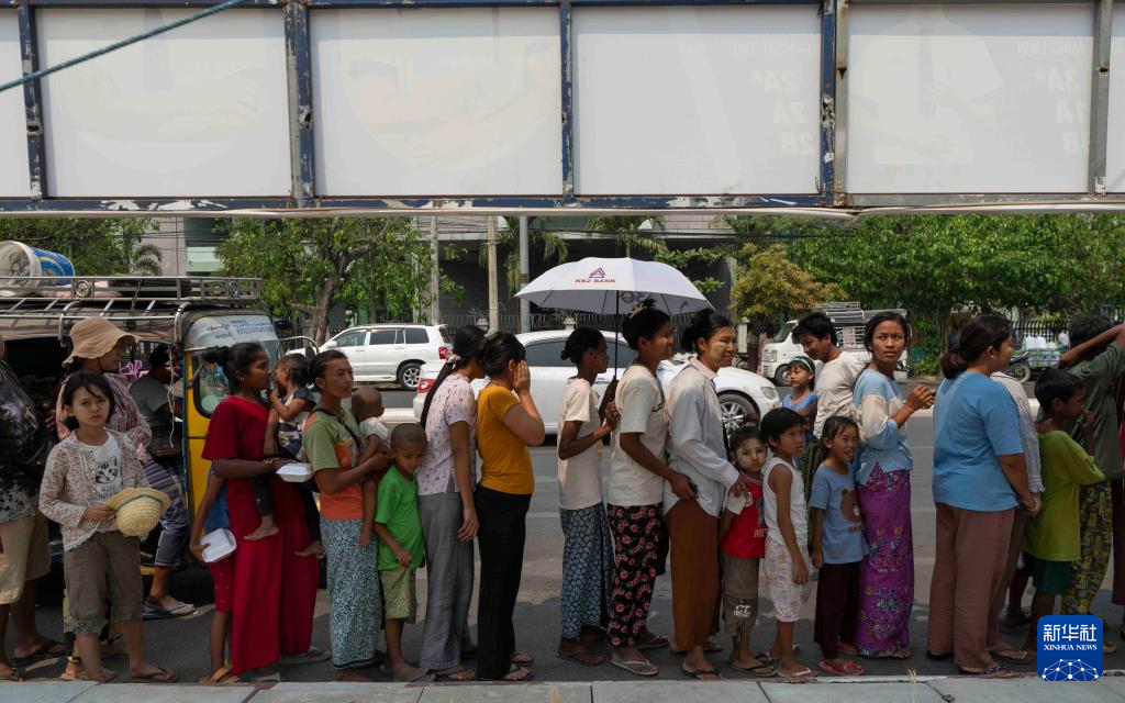 4月3日,在缅甸曼德勒医学院附近的一处安置点,人们排队领取食物。