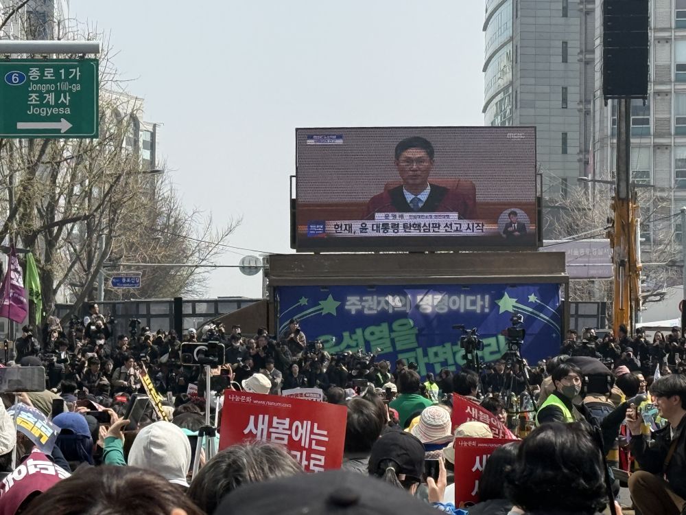 ↑4月4日,人们在韩国首都首尔的韩国宪法法院附近观看尹锡悦弹劾案宣判过程的电视直播。