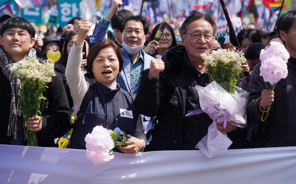 4月4日,民众在韩国首都首尔街头庆祝尹锡悦弹劾案获得通过。新华社发(王申摄)