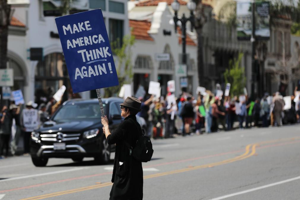 3月29日,示威者聚集在美国加利福尼亚州帕萨迪纳的一家特斯拉门店外。新华社发(邱晨摄)