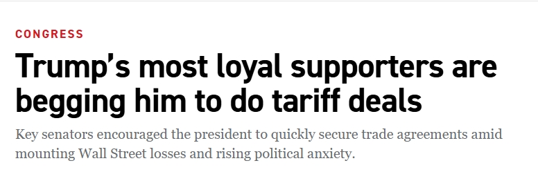 美国政界越来越焦虑,一些共和党籍国会议员急于为动荡的市场寻找出路,多名关键议员呼吁特朗普迅速与关键贸易伙伴达成协议。
