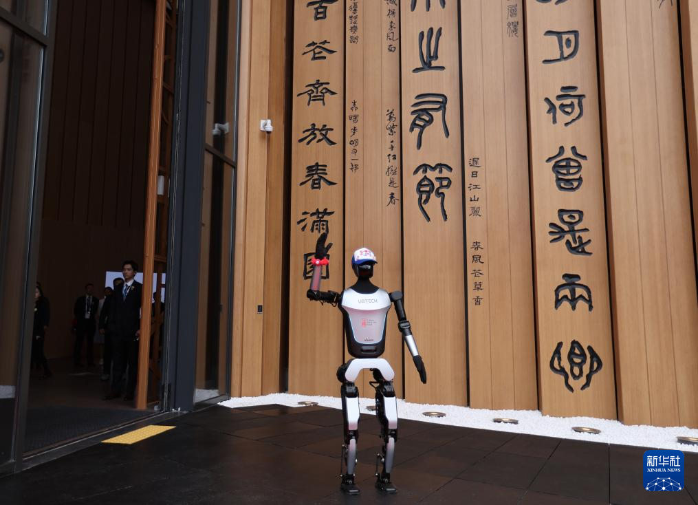 4月13日,在日本大阪,人形机器人在中国馆外向嘉宾招手致意。