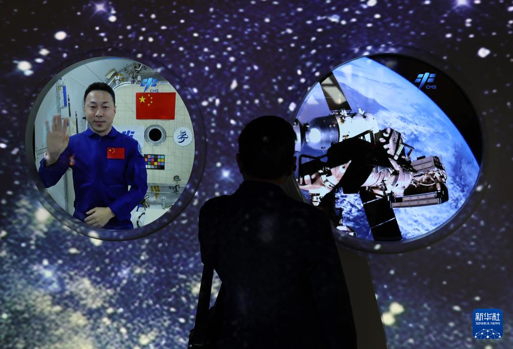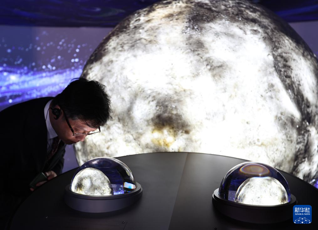 4月13日,在日本大阪,参观者在中国馆内参观嫦娥五号、嫦娥六号探测器采集的月球土壤样品。