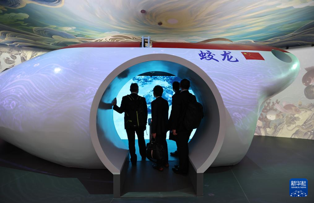 4月13日,在日本大阪,参观者在中国馆内参观游览“蛟龙号”深潜体验舱。