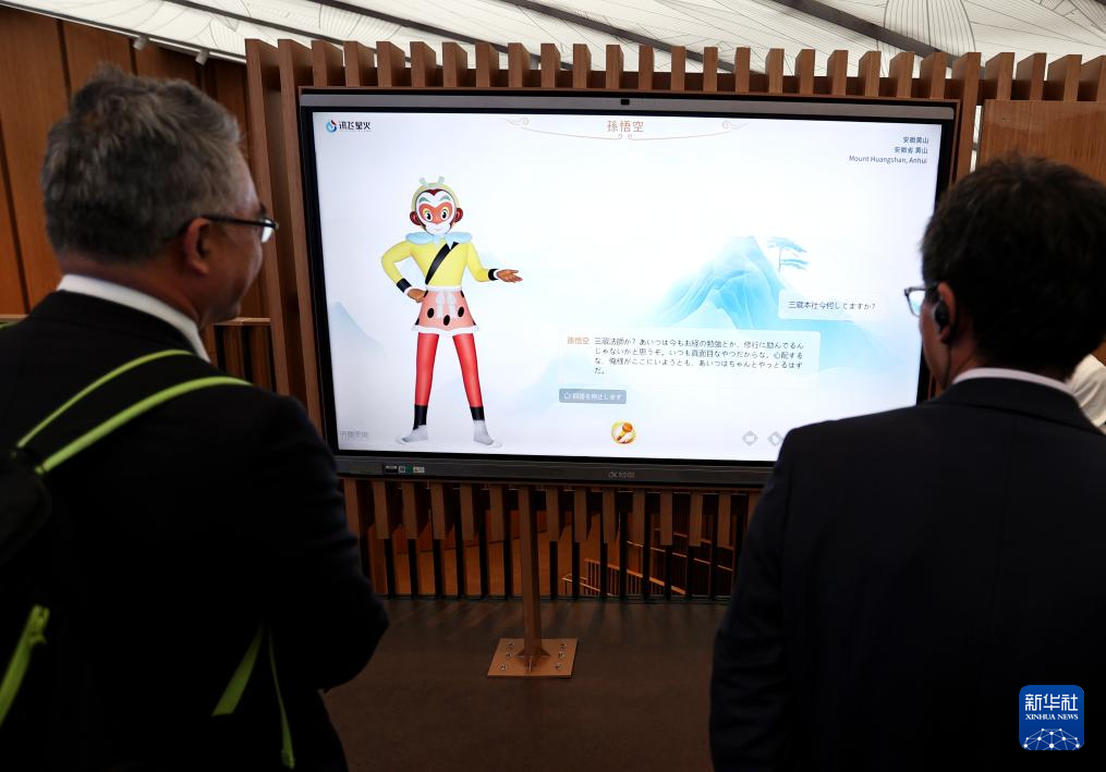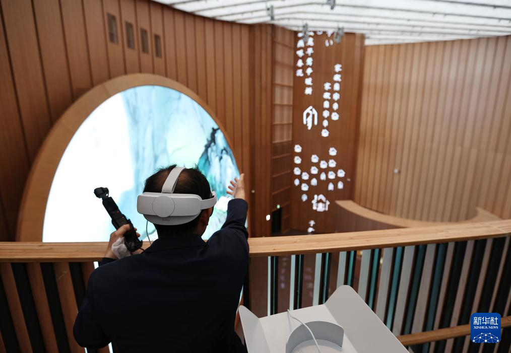 4月13日,在日本大阪,参观者在中国馆内体验MR(混合现实)眼镜。