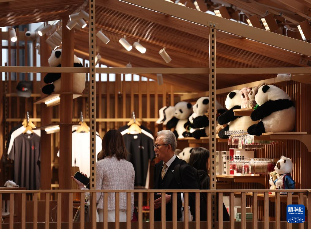 4月13日,在日本大阪,参观者在中国馆的纪念品商店内选购。