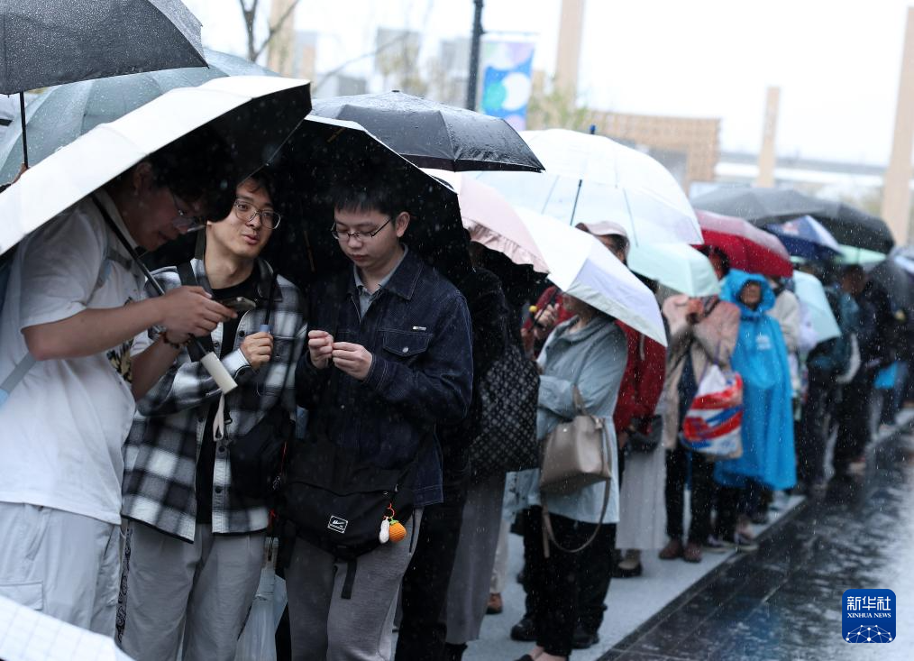 4月13日,在日本大阪,参观者撑伞在中国馆外排队等待。