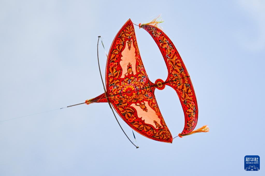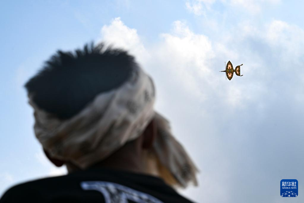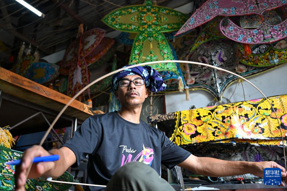 3月27日,在马来西亚吉兰丹州哥打巴鲁市附近的村子里,手工艺人测试风筝骨架的柔韧度。