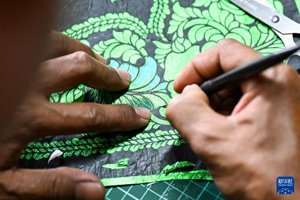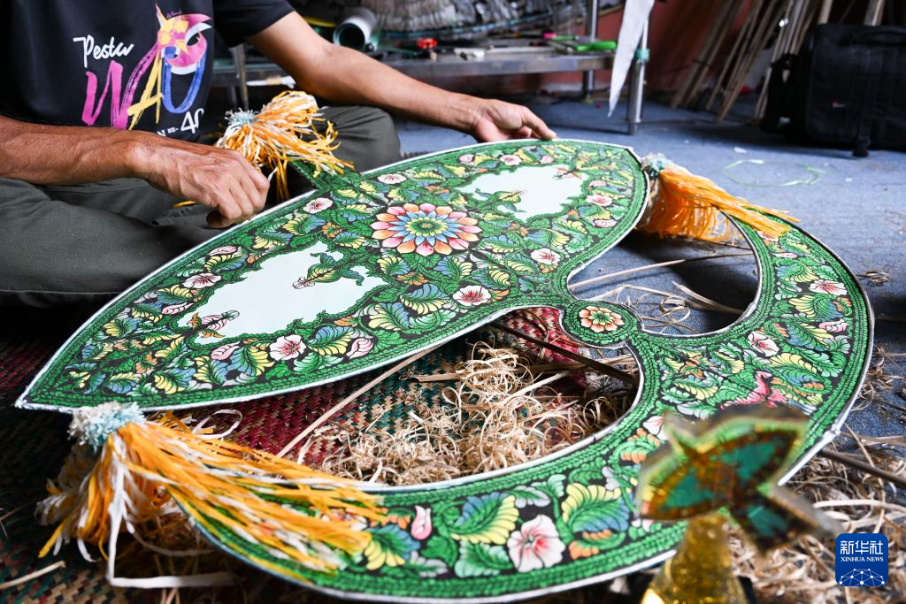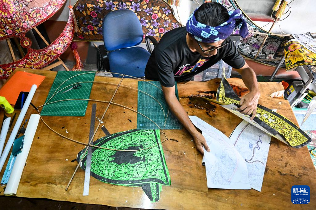 3月27日,在马来西亚吉兰丹州哥打巴鲁市附近的村子里,手工艺人雕刻风筝花纹。