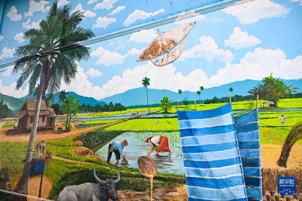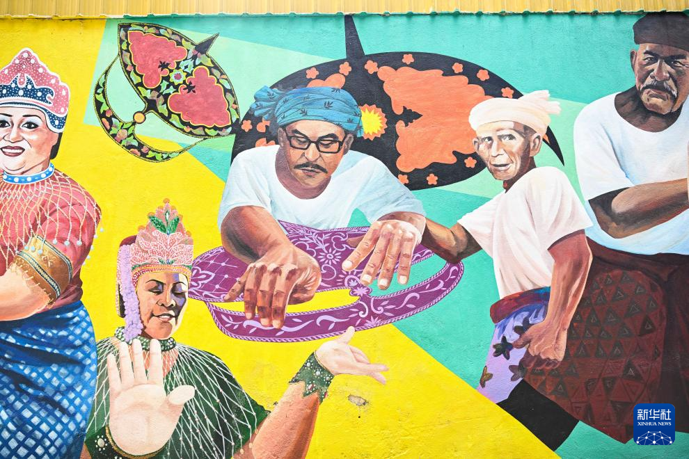 3月28日,在马来西亚吉兰丹州哥打巴鲁市的壁画街,一面墙上描绘了当地旧日的田园风光,一只月亮风筝在天空飞翔。