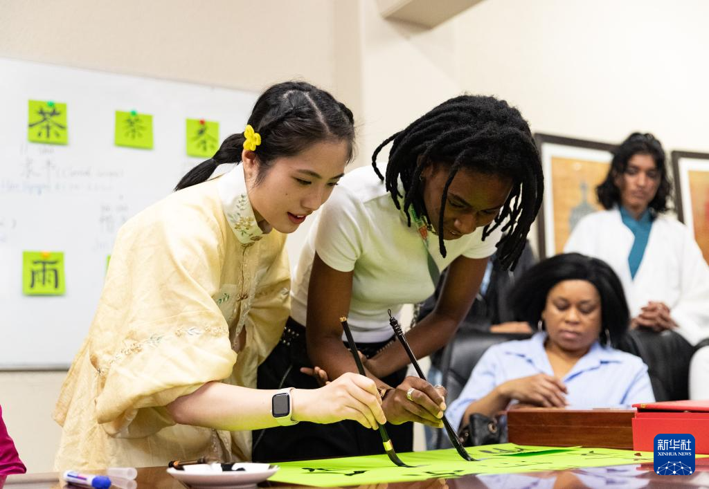 4月17日,在南非约翰内斯堡,学生在“国际中文日”活动上写毛笔字。