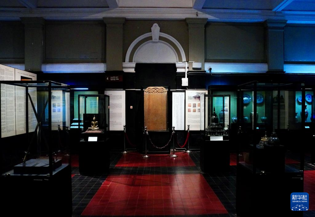 4月17日,郑和遗存《布施锡兰山佛寺碑》(中)在斯里兰卡科伦坡国家博物馆主展厅展出。
