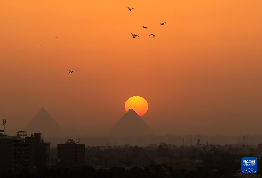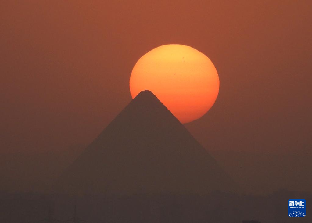 这是4月19日在埃及开罗拍摄的吉萨金字塔群日落景色。