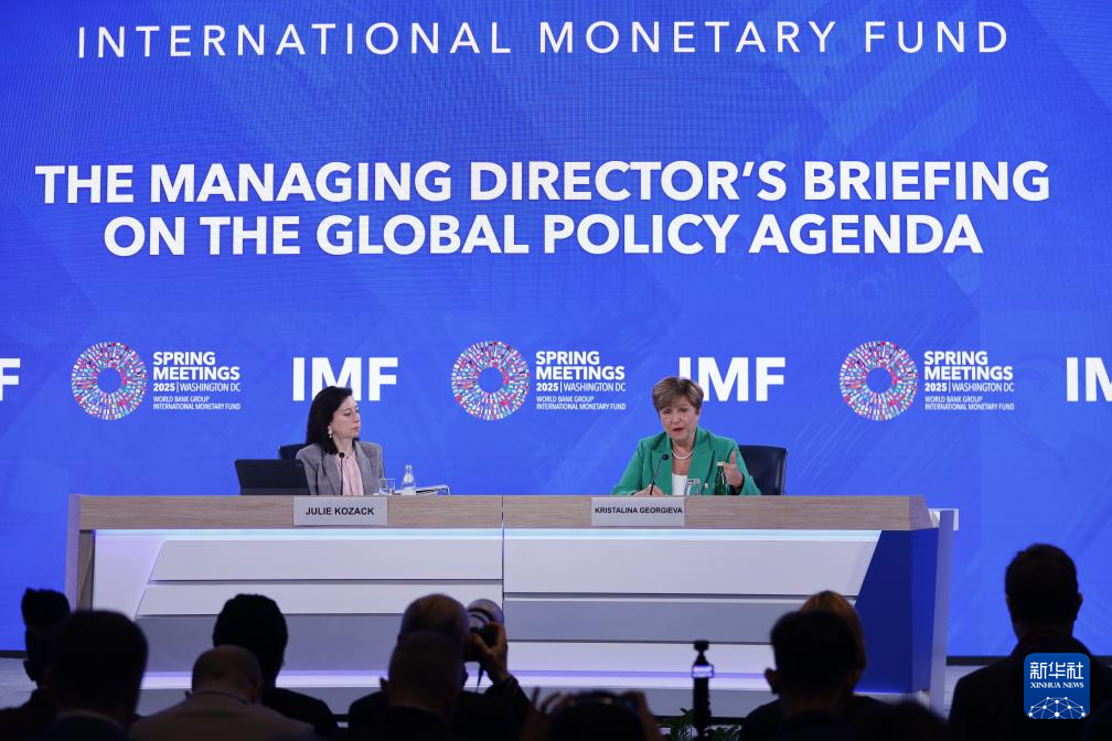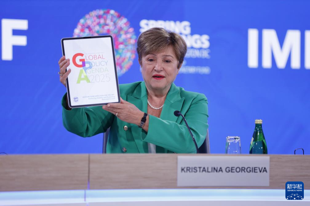 4月24日,国际货币基金组织(IMF)总裁格奥尔基耶娃在美国华盛顿举行的媒体发布会上展示《全球政策议程》。