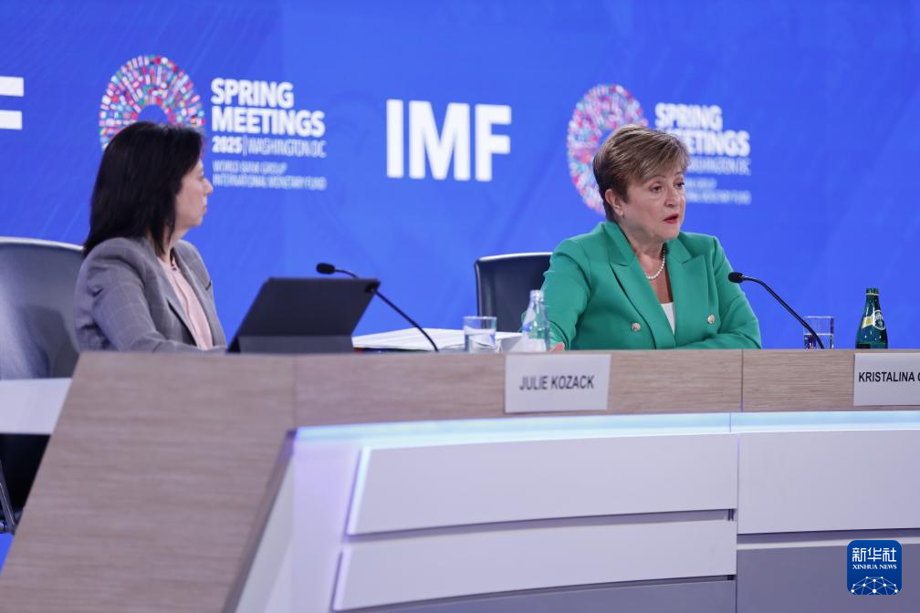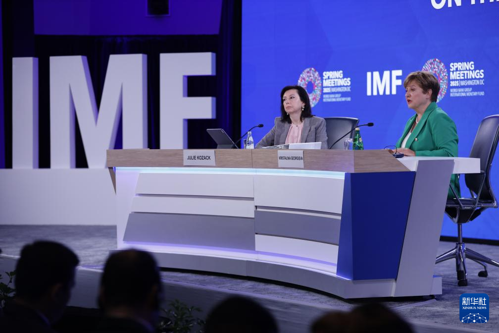 4月24日,国际货币基金组织(IMF)总裁格奥尔基耶娃(右)在美国华盛顿出席媒体发布会。