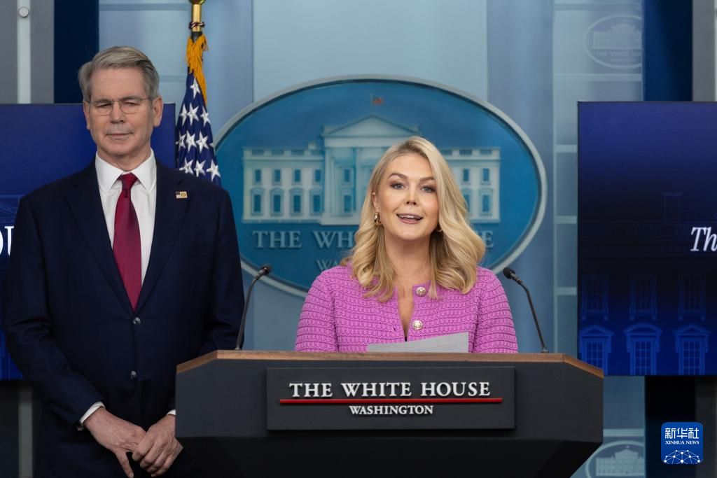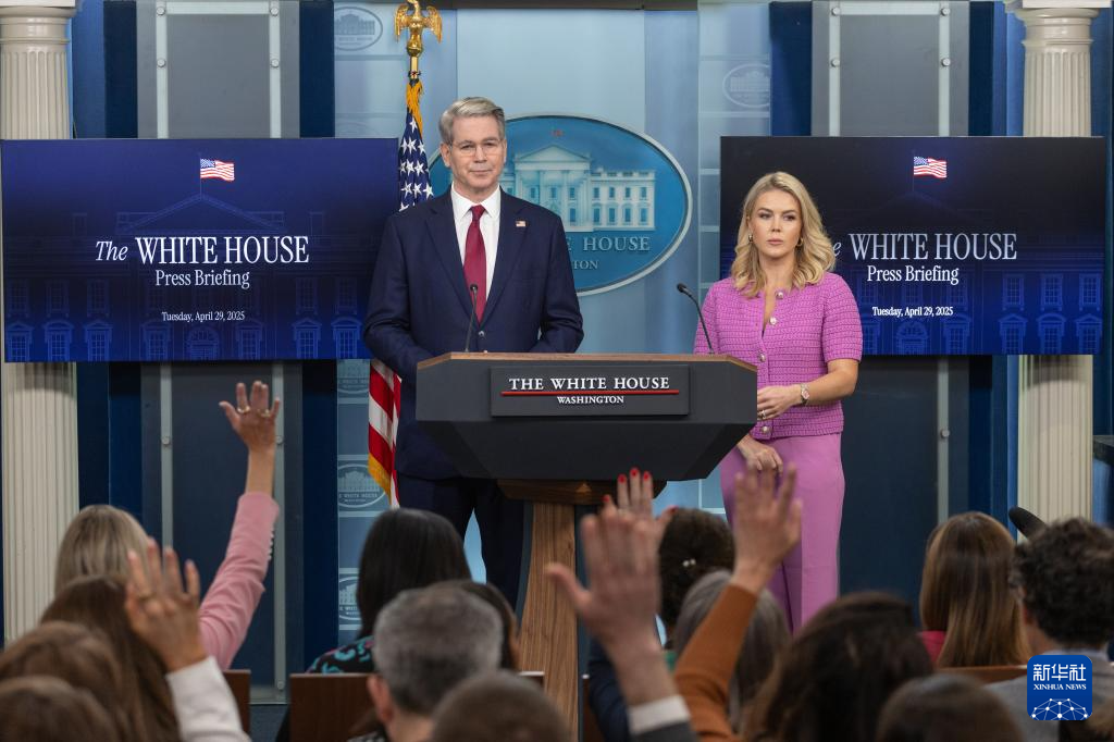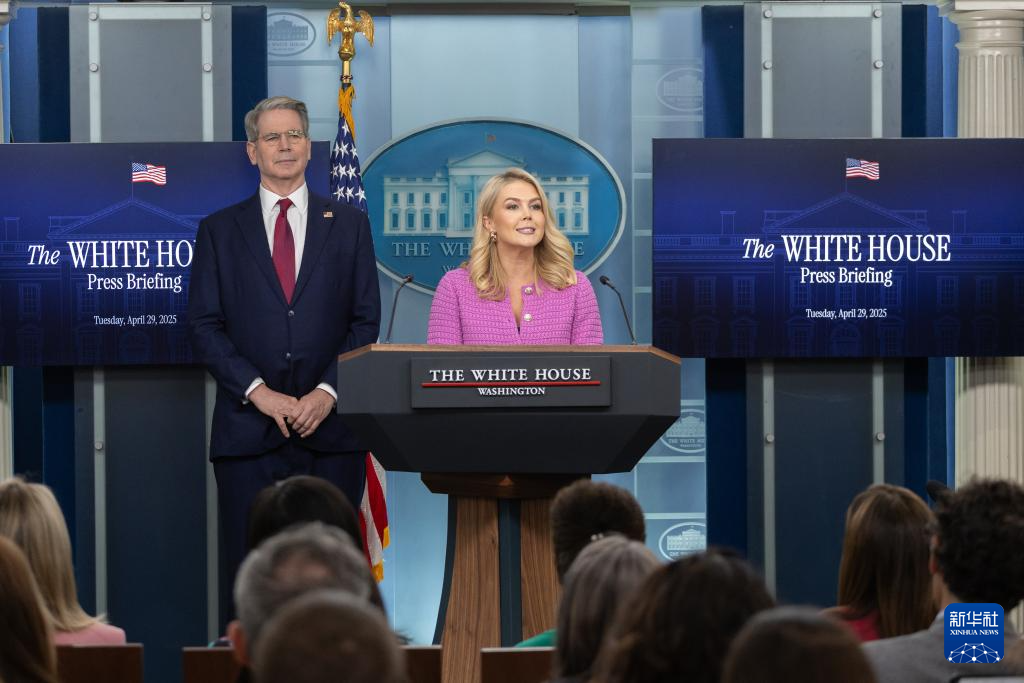 4月29日,美国白宫新闻秘书卡罗琳·莱维特(右)与美国财政部长斯科特·贝森特在华盛顿白宫出席记者会。