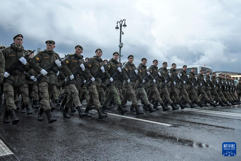 4月29日,在俄罗斯首都莫斯科,参加阅兵式彩排的士兵列队行进。