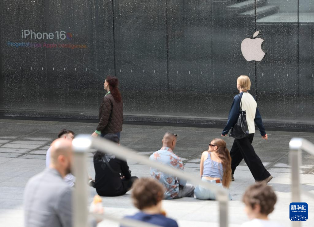 人们在意大利米兰的一家苹果门店前休息(4月12日摄)。