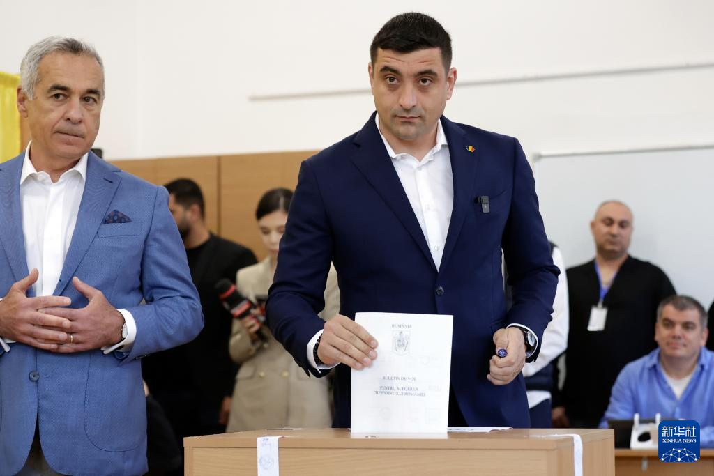 5月4日,罗马尼亚人团结联盟党主席乔治·西米翁(右)在首都布加勒斯特的一处投票站参加总统选举投票。