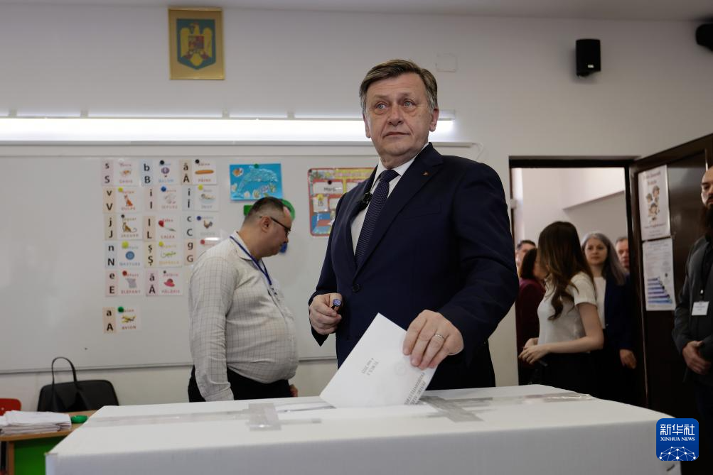 5月4日,罗马尼亚前进选举联盟候选人克林·安东内斯库在首都布加勒斯特一处投票站参加总统选举投票。